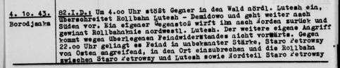 „Feind- und eigene Lage unverändert. Tag verlief im Abschnitt der Division im Allgemeinen ruhig. […] Lebhaftes Artillerie- und Granatwerferfeuer, insbesondere im Raum Staro Petrowzy. […]“
