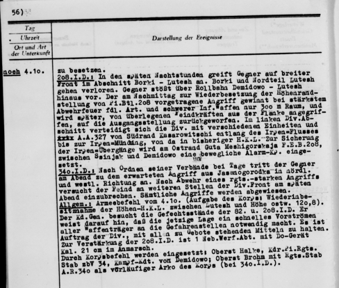 „[…] Das Korps kämpfte auch am 10.10. unter Einsatz aller Reserven vornehmlich im Raum Ljutesh – Guta Meshigorskaja gegen einen Feind, der sich laufend verstärkte und an der ganzen Korpsfront nunmehr auch teilweise mit Panzer- und Luftwaffenunterstützung Angriffe in Btls. Stärke führte […]“.