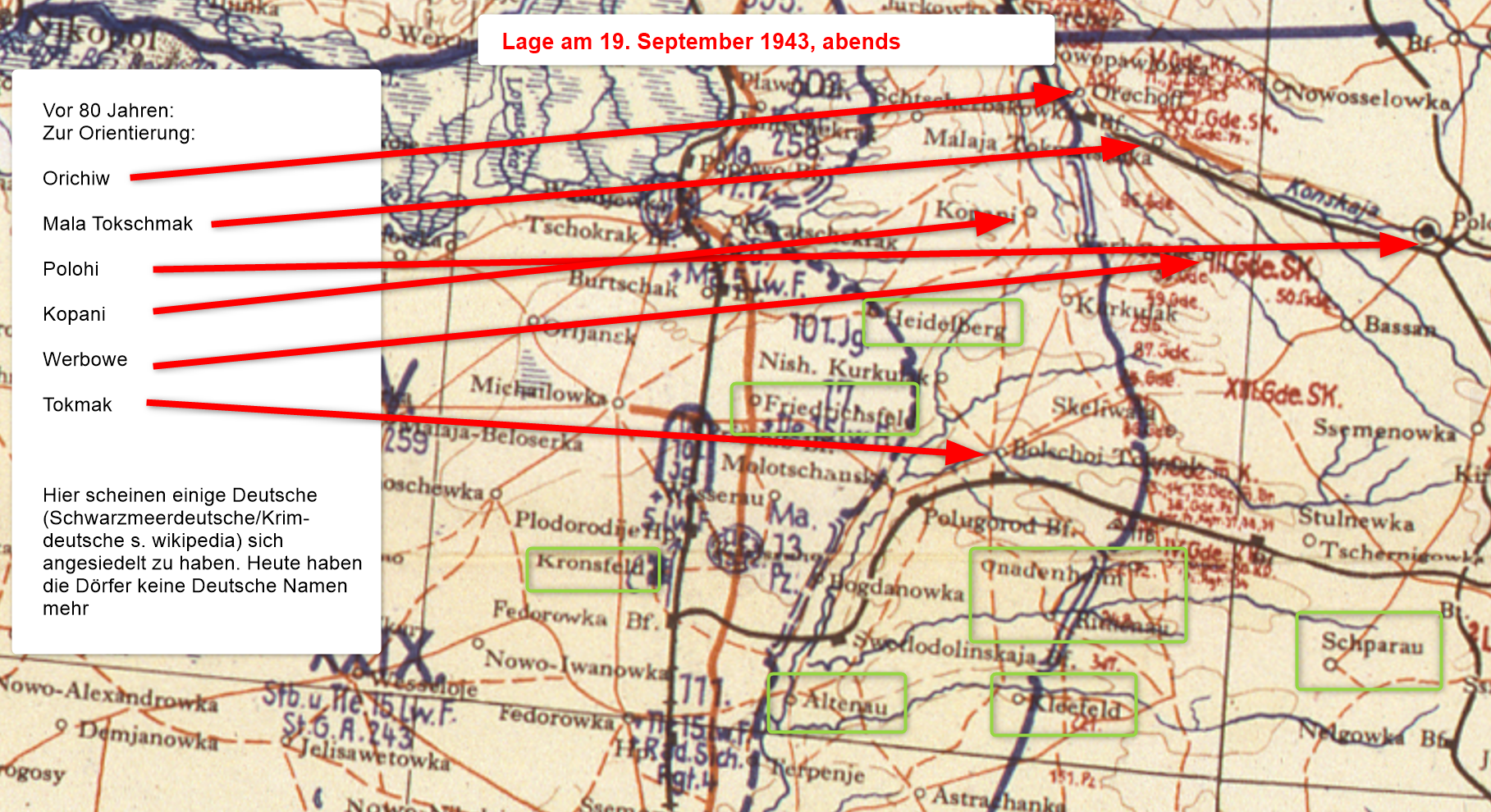 Im Dreieck von Orihiw (Орихив), Robotyne (роботине) und Werbowe (Вербовое)Hier mal eine Lagekarte zu den Kämpfen vor 80 Jahren in der Südukraine, zum 19. September 1943, abends.