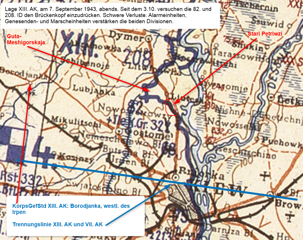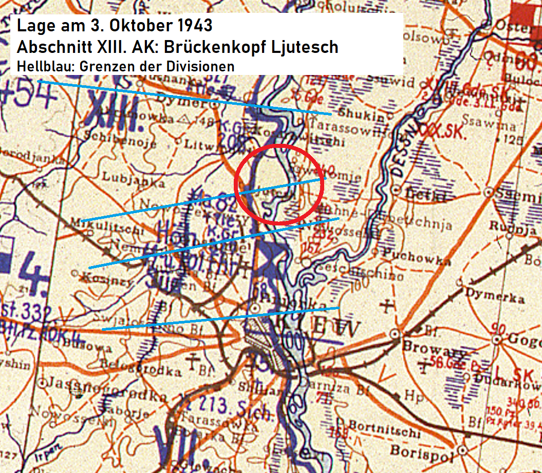 Die Front des XIII. AK ist aufgeteilt (von Süd nach Nord): 68. ID: Wyschgorod - Novi Petriwzi, 82. ID Novi-Petriwzi - Muta-Meshigorska; 208. ID Muta-Meshigorska - Dymer (Giebowka) - 340. ID Dymer (Giebowka) - Tolokunskaja Rudnja