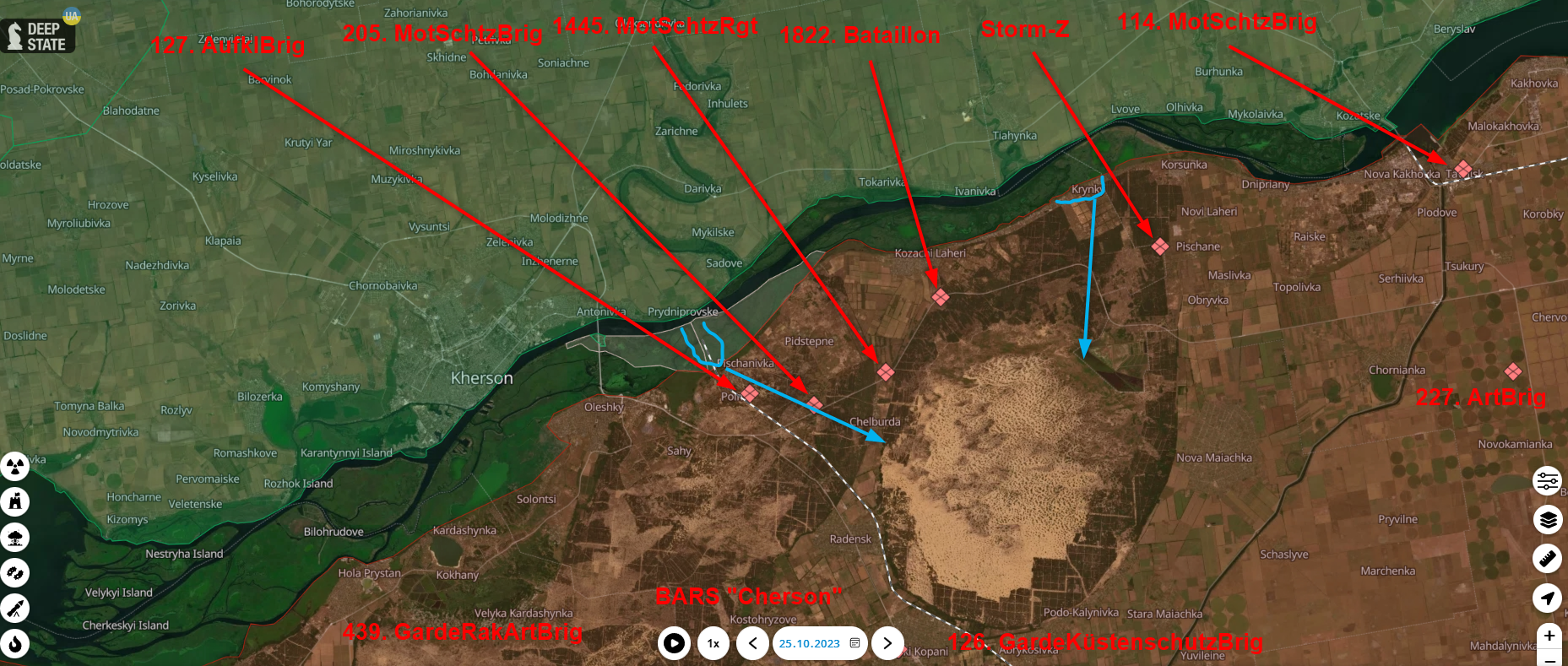 In den letzten drei Wochen kam es auf ukrainischer Seite zur Bildung mehrerer Brückenköpfe bei Krinky (46.7464481257208, 33.11579704284669) und bei Pischanivka (46.64790423818282, 32.83590316772462). Der vorhandene Brückenkopf bei Oleshky wurde etwas erweitert. Am vergangenen Mittwoch, den 25. Oktober 2023, haben die Russen dann mit der Verlegung von mind. 2 Brigaden (114. MotSchtzBrig bei Nova Kakhovka, einer Storm-Z Einheit bei Pischane (ich kenne die Grösse nicht, vermute Btl Grösse) und der 127. AufklBrig bei Poima. Eine russische Brigade entspricht ca. 5000 Mann.