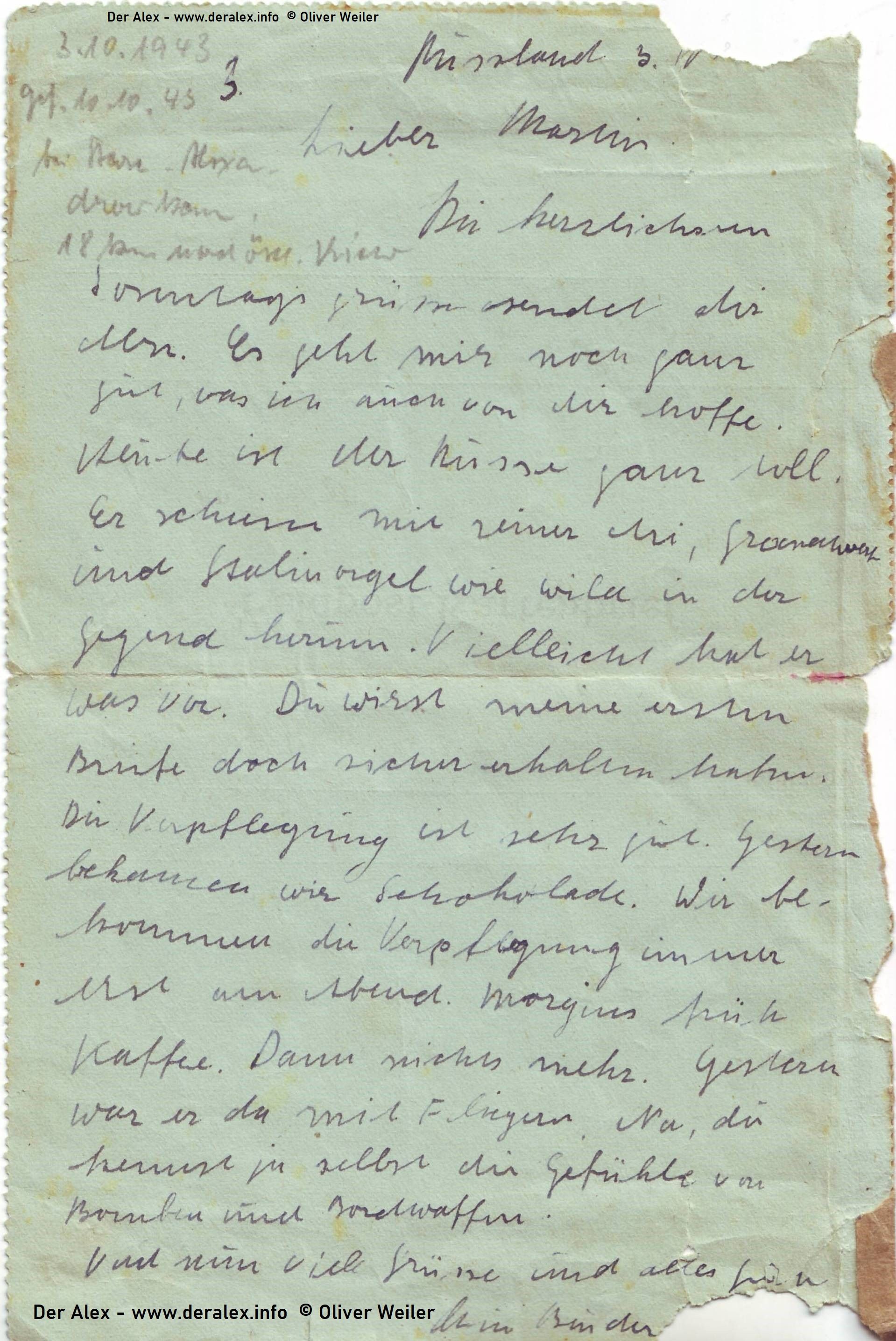 An Alex’ Todestag, dem 10. Oktober 1943, wurde der Brief gestempelt. Die mit Bleistift verfassten Notizen oben links sind von Martin und betreffen Alex’ Todestag und -ort mit der Angabe „18 km nordwestlich Kiew“. Die 3 bedeutet, dass es der 3. Brief von Alex an Martin war. Auch Opa, Oma und Uropa haben ihre Briefe so fortlaufend nummeriert.