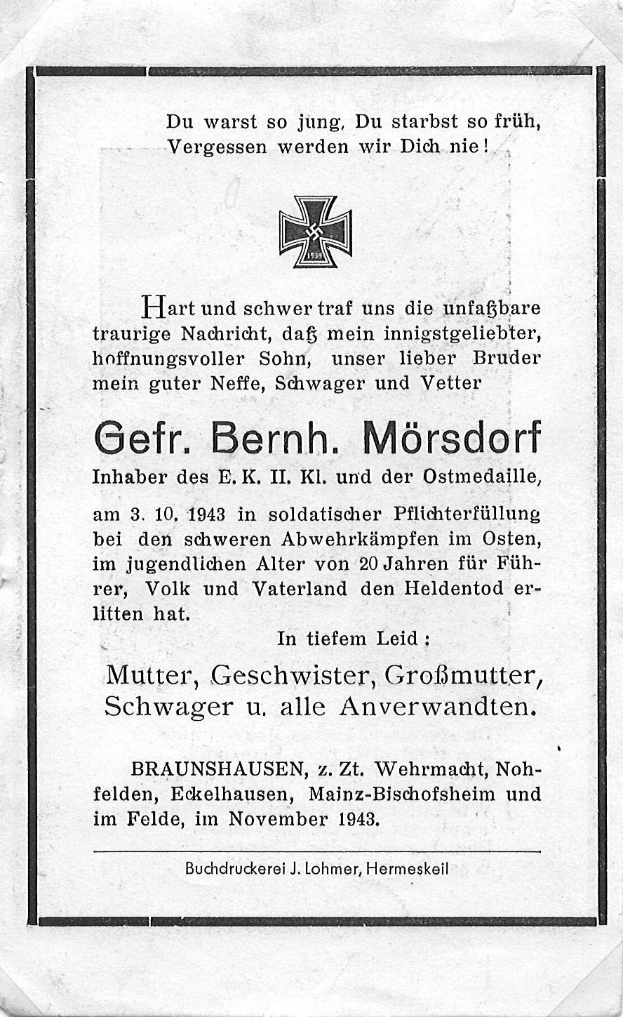 "Hunnes Bubi", Bernhard Mörsdorf. Bubi, 1 Jahr älter als Alex, fällt im Dnjeprbogen auf der Höhe 244,5 nördl.Grigorowka, Dnjepr