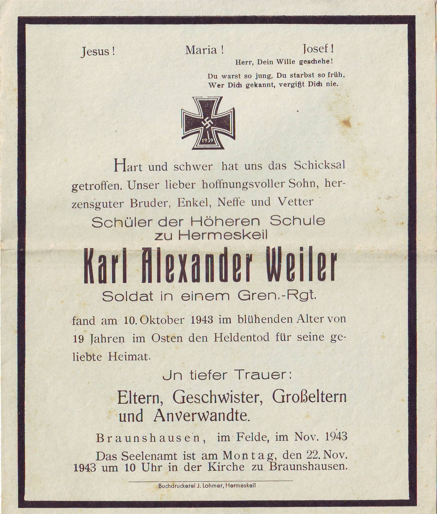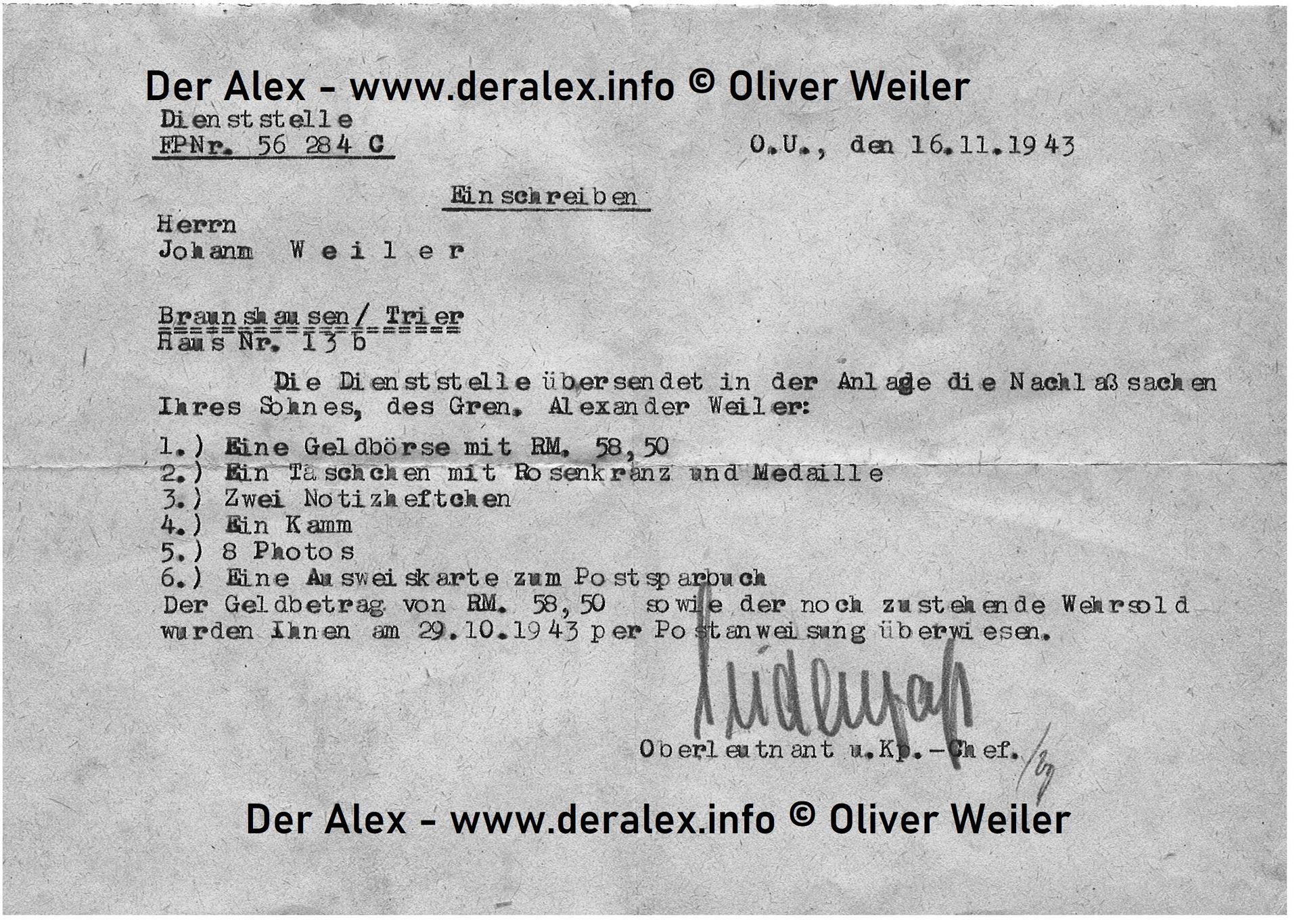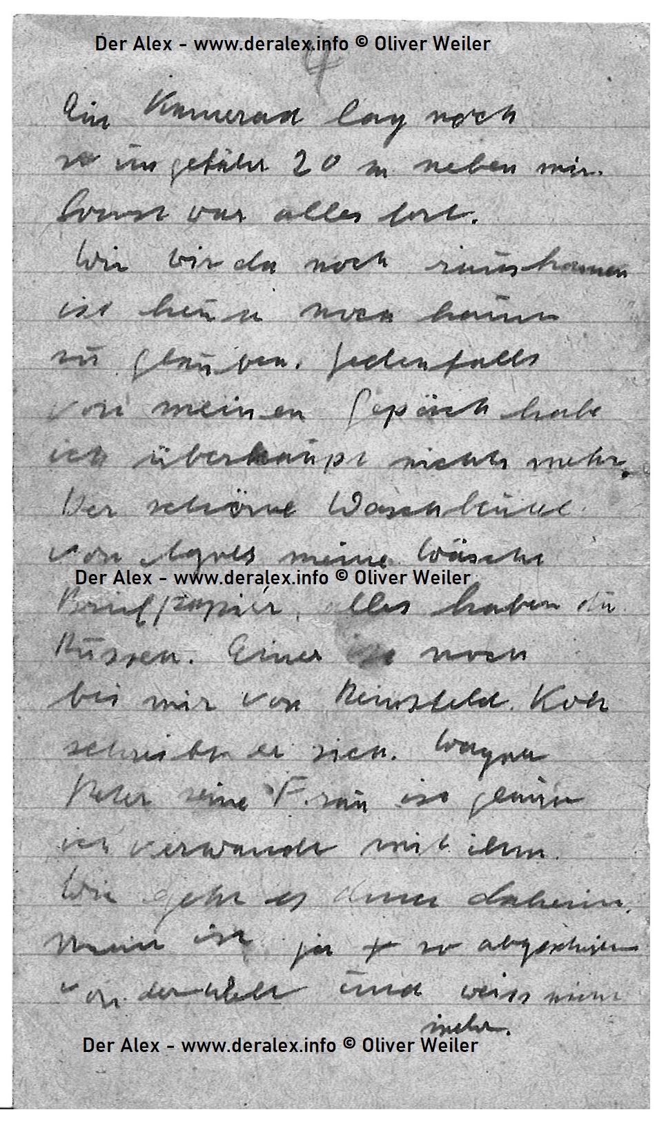 „Am ersten Dezember komme ich um 08.00 Uhr in Reinsfeld an. Am dritten fahre ich nach Butzweiler. Von dort muss ich eine Stunde bis Bierfeld laufen. Am vierten gehe ich von Butzweiler nach Braunshausen. Ich besuche die Eltern von Alex Weiler. Er ist am 8. Oktober gefallen. Nachts vorher war ich noch mit ihm zusammen. Sein Abendessen hatte er mir mit der Bemerkung gegeben: „ich bringe nichts runter. Iss Du, wir kommen hier nicht lebend raus.“ Ich versuchte ihm Mut zu machen, aber er war total deprimiert. Erst am 10. Oktober erfuhr ich, dass Alex am 8. gefallen war. Er war in der zweiten Kompanie, ich in der vierten. Sein Vater sagt mir, Alex hätte bei seinem letzten Urlaub im August viel vom Tod gesprochen. Bei der Getreideernte sagte er einmal: „Wenn die Stoppeln faul sind, dann bin ich auch faul“ Es ist eine bedrückende Atmosphäre bei seinen Angehörigen. [sic!]“