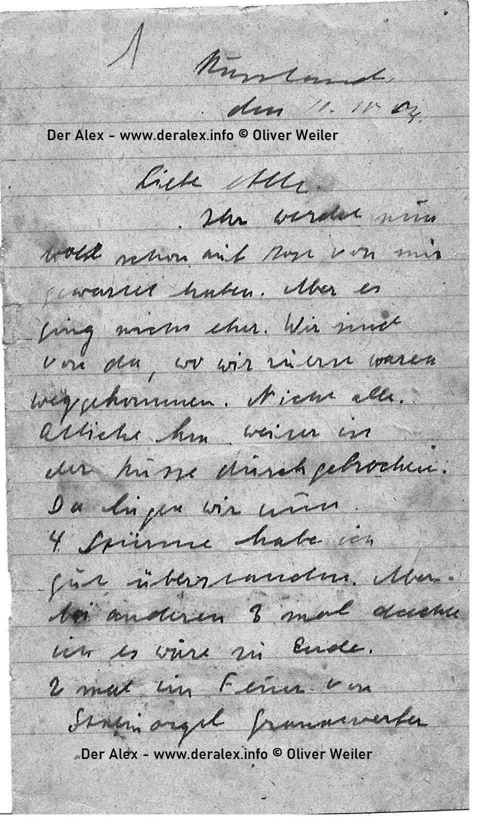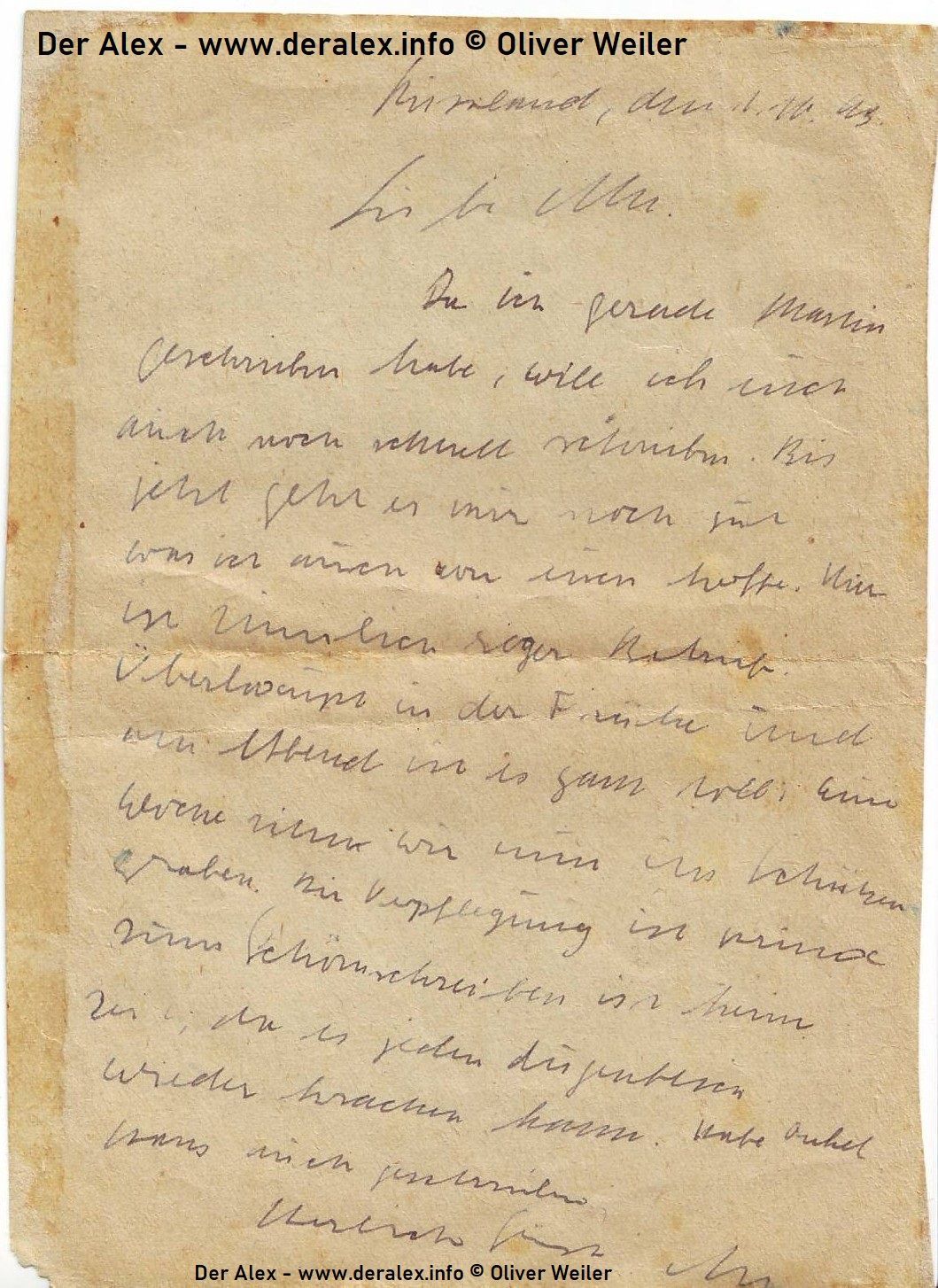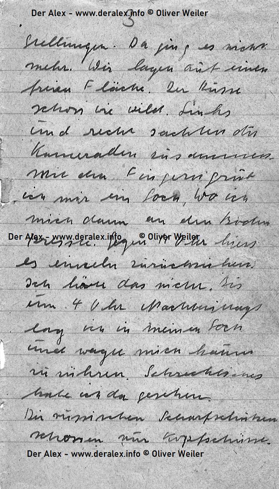 „Am ersten Dezember komme ich um 08.00 Uhr in Reinsfeld an. Am dritten fahre ich nach Butzweiler. Von dort muss ich eine Stunde bis Bierfeld laufen. Am vierten gehe ich von Butzweiler nach Braunshausen. Ich besuche die Eltern von Alex Weiler. Er ist am 8. Oktober gefallen. Nachts vorher war ich noch mit ihm zusammen. Sein Abendessen hatte er mir mit der Bemerkung gegeben: „ich bringe nichts runter. Iss Du, wir kommen hier nicht lebend raus.“ Ich versuchte ihm Mut zu machen, aber er war total deprimiert. Erst am 10. Oktober erfuhr ich, dass Alex am 8. gefallen war. Er war in der zweiten Kompanie, ich in der vierten. Sein Vater sagt mir, Alex hätte bei seinem letzten Urlaub im August viel vom Tod gesprochen. Bei der Getreideernte sagte er einmal: „Wenn die Stoppeln faul sind, dann bin ich auch faul“ Es ist eine bedrückende Atmosphäre bei seinen Angehörigen. [sic!]“