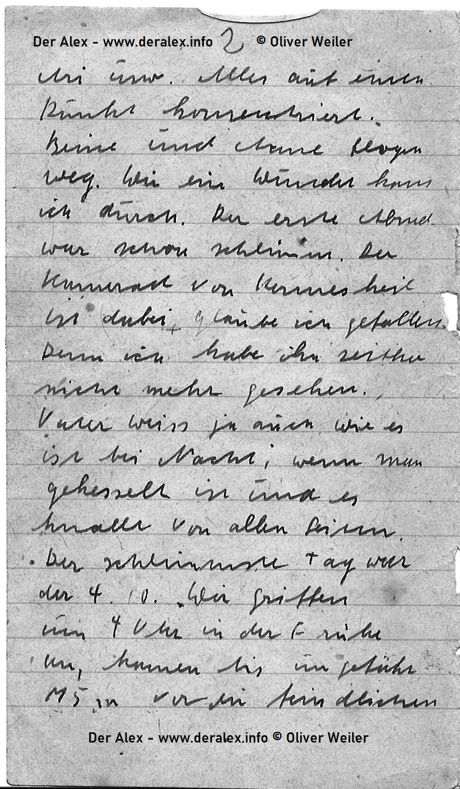 Ari [Artillerie] usw. Alles auf einen Punkt konzentriert. Beine und Arme flogen weg, wie ein Wunder kam ich durch. Am ersten Abend war’s schon schlimm. Der Kamerad von Hermeskeil ist dabei, glaube ich, hinter mir gefallen, denn ich habe ihn seither nicht mehr gesehen. Vater weiss ja auch, wie es ist bei Nacht, wenn man gekesselt ist und es knallt von allen Seiten. Der schlimmste Tag war der 4.10. Wir griffen um 4 in der Frühe an, kamen bis ungefähr 75 m vor die feindlichen
