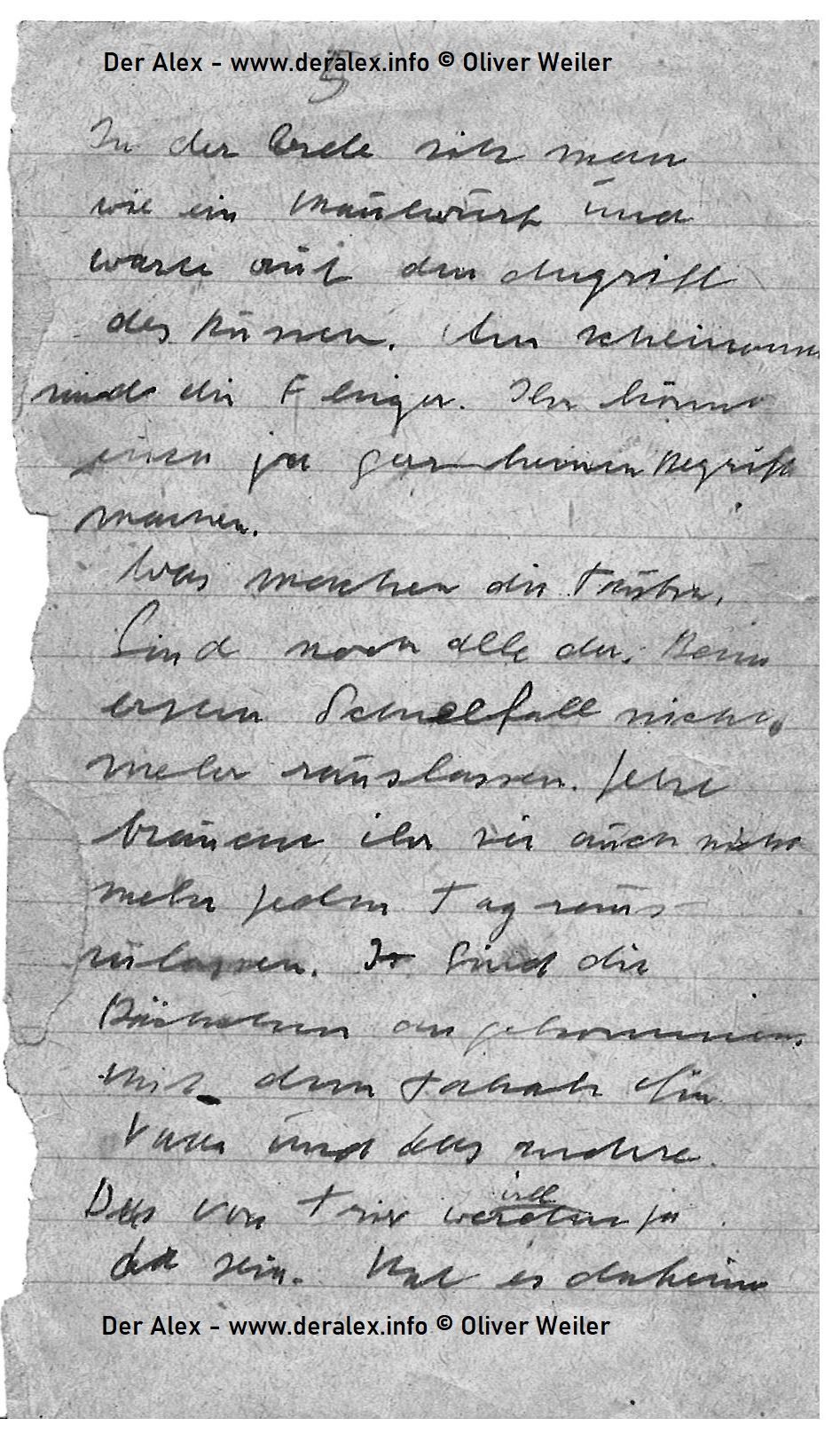 Dann berichtete er von russischen Scharfschützen, die Explosionsgeschosse einsetzten. Auch der Alex erwähnte die Scharfschützenplage: „[…] Die russischen Scharfschützen schossen nur Kopfschüsse […]“
