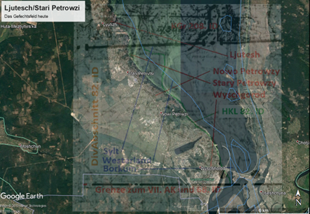 Hier ein Overlay der Lagekarte um den 7. Oktober 1943. Die 68. ID hat den Wyschgorod noch nicht übernommen. Die alte Landschaft, vor der Anlage des Kiewer Meeres, ist zu erkennen. Man sieht, wieviel Land jetzt unter der Wasserlinie liegt.