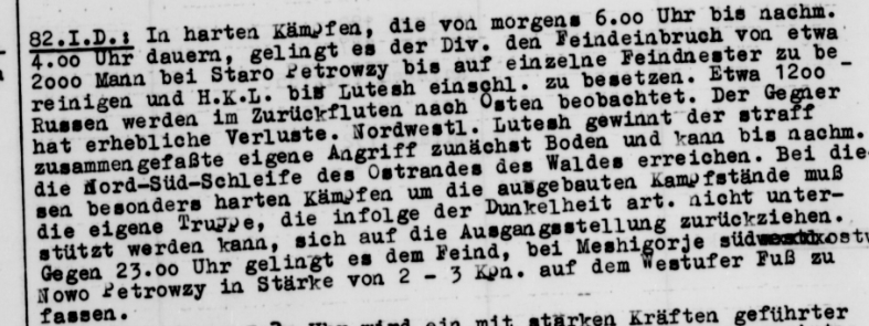 „82. ID hält Höhenstellung HKL in der Linie rechte Abschnittsgrenze bis Nordrand Ljutesh und setzt sich unter Zusammenfassung aller verfügbaren Kräfte in Besitz der Höhenstufe am Ostrand des Waldes nördlich Ljutesh und hält sie. […] Hierzu werden der Division sämtliche in diesem Abschnitt stehenden Teile der 82. ID unterstellt. […]“